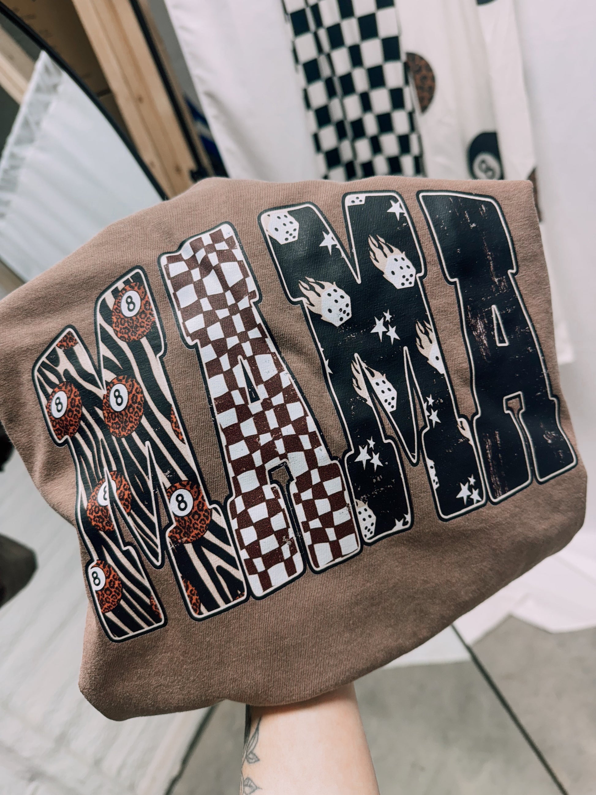 mama graphic tee, flame dice shirt, neutral mama tee, comfort colors mama shirt, espresso comfort colors tee, boutique graphic tee